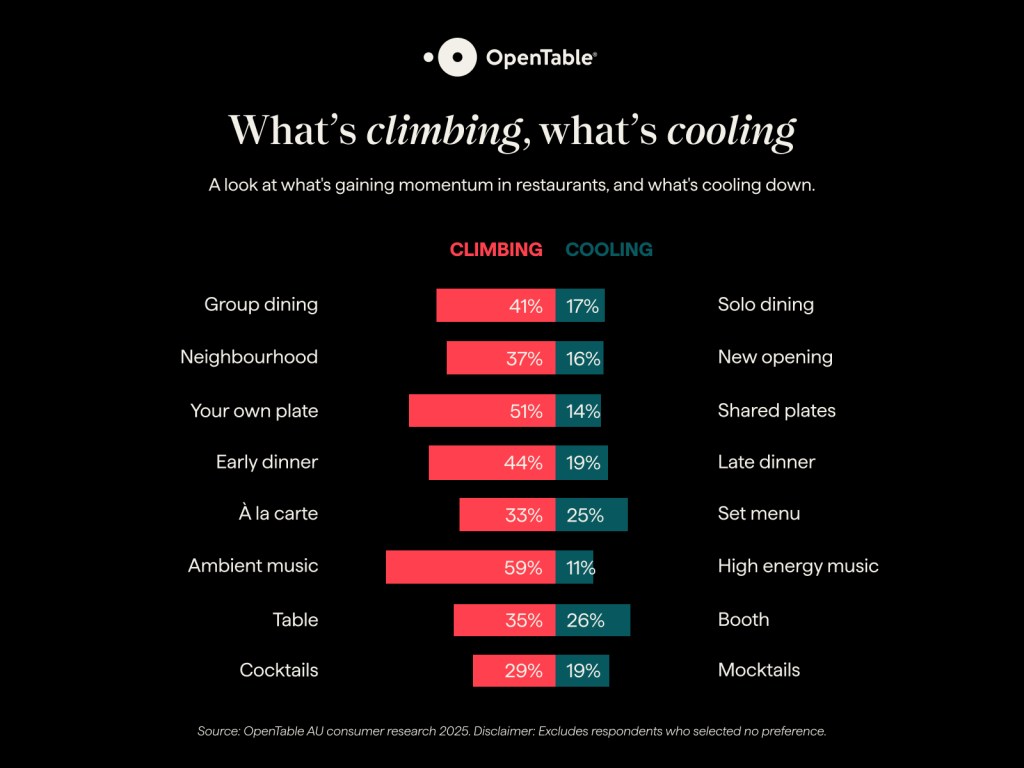 Australians are leaning into group hangs, with 41 per cent preferring to dine with others and only 17 per cent choosing to eat out solo. Bookings for groups of six or more rose by 16 per cent this year.